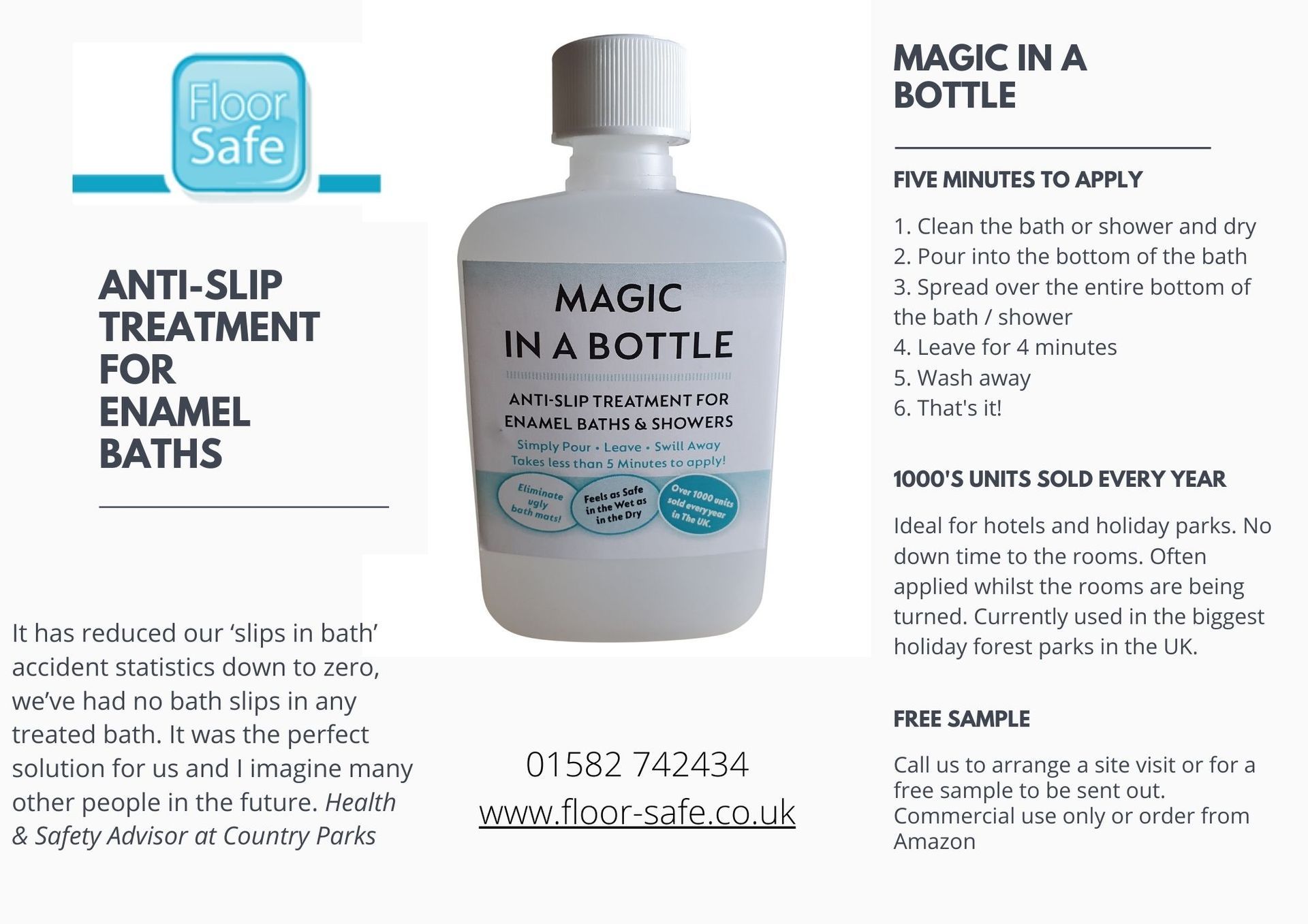 Floor-safe anti-slip treatment ‘Magic in a Bottle’ is specially formulated for enamel baths and shower trays. In just five minutes, increase the safety of your baths / showers. Trusted by holiday villages with over 1000 baths every year and has been applied by renowned hospitality giants like Marriott, Hilton, and Travelodge, our treatment is aimed at prioritising safety. Applied by the maintenance team within minutes whilst the rooms are being turned. Free onsite demos can be arranged for commercial clients.
